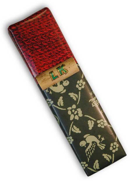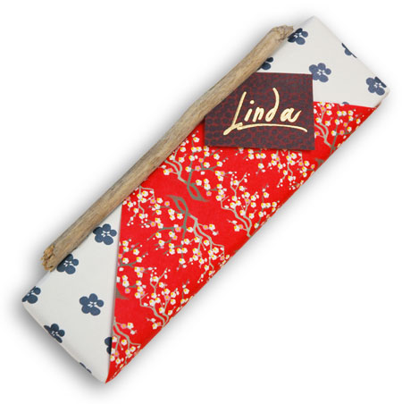 The first piece of paper comes from a Japanese small-item shop bag. The second piece is an image of knitted yarn from a brochure. I used a twig as the "bow" of the wrap, detailing the initials in three colors of paint markers.