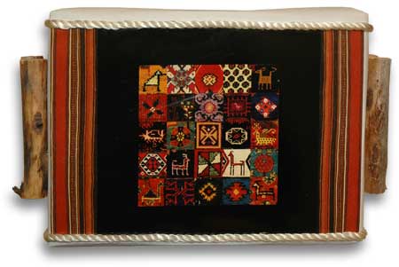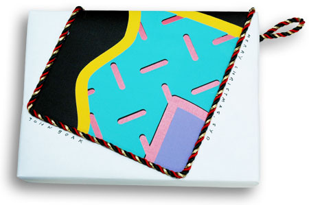 I continued my studies in cord gluing. I applied a fragment of a press-proof to a whitewrap. One could use almost anything for this fragment: magazine or mailer fragment, wrapping or wall paper fragment. I then glued decorative cord around the fragment, looping the remaining cord into a handle, useful when giving the gift to the recipient.