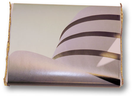The wrap began with a white wrap. As usual, I was improvising; I had no idea what direction I might go in. The gift was for an architect. I saw in my paper drawer this image, from a brochure, of the Frank Lloyd Wright Guggenheim Museum. On it went. I added complex gold ribbon on the two white ends. Done.