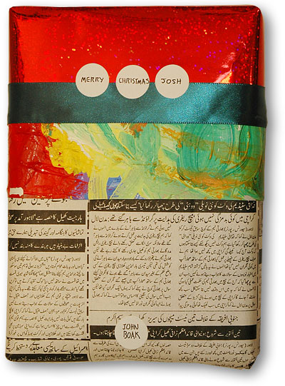 The top piece of paper is the same mettalic red shoping bag you may have seen on a variety of wraps here. The second piece is something much harder to come by: a sheet of artist's palette paper covered with acrylic paints. And last of all, a piece of newsprint from Karachi. Then I added one band of green ribbon. And some office-supply dots for labels