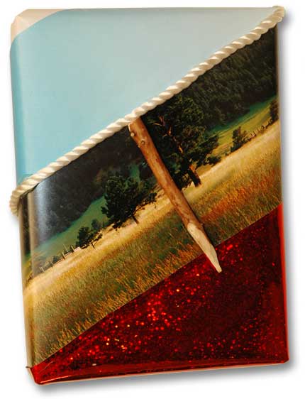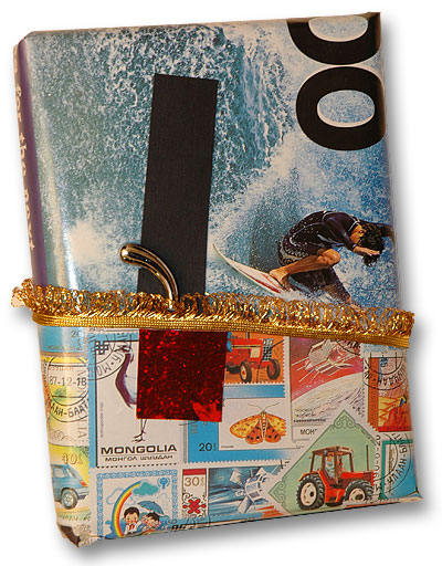 One page of a surf magazine. One page of a stamp flyer. Black and red fragments for labels. Gold Ribbon. And a fragment of chromed metal. This rap relies on this diversity of materials, all but ribbon alien to regular wrapping materials.